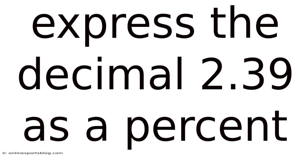When you encounter the decimal 2.Which means 39 in a math problem, a financial report, or a data set, you’ll often need to convert it to a percent to make the information more intuitive for a wider audience. Expressing a decimal as a percent is one of the most fundamental skills in mathematics, yet many students and professionals still stumble over the process. 39 into a percent, explains why the method works, and explores real‑world contexts where this transformation matters. This article walks you through the conversion of 2.By the end, you’ll not only know how to turn 2.39 into 239 %, but you’ll also understand the underlying concepts that make the conversion reliable for any decimal number.