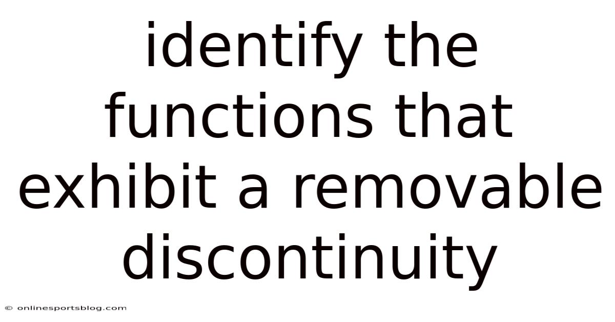 Identifying the functions that exhibit a removable discontinuity requires a thorough understanding of limits, function definitions, and algebraic manipulation. Because of that, by following the outlined steps and recognizing the graphical and algebraic signs, you can effectively pinpoint and address these discontinuities. Mastery of this concept not only enhances your analytical skills but also deepens your appreciation for the subtleties of mathematical functions. Whether you are solving equations, modeling real-world phenomena, or preparing for advanced studies, the ability to identify and handle removable discontinuities is an invaluable tool in your mathematical toolkit Not complicated — just consistent. That alone is useful..